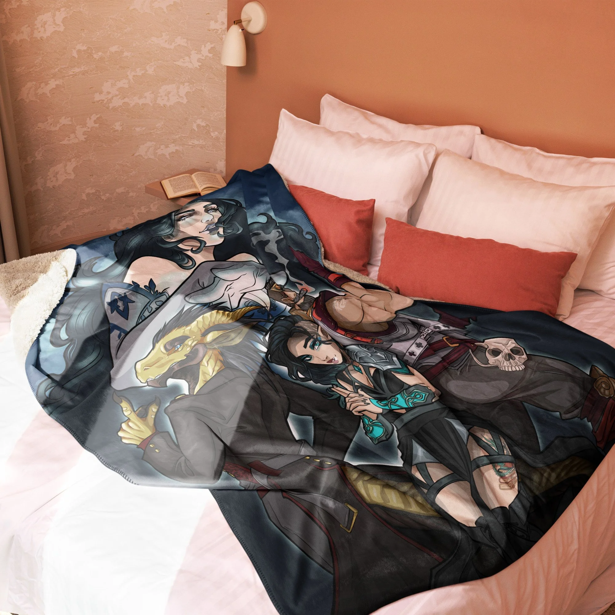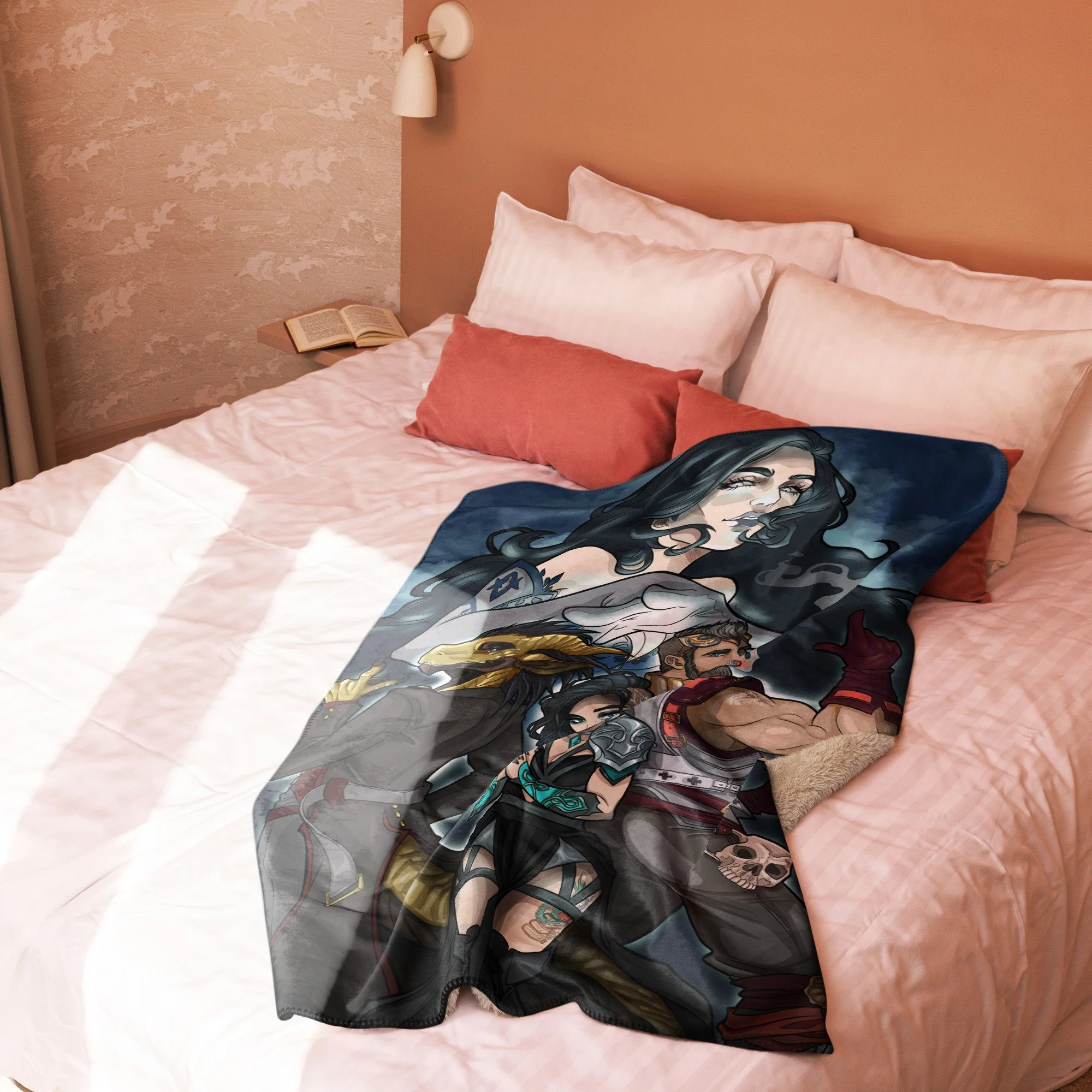 Step into the shadows of Toivoa with the Leslie’s Angels Sherpa Blanket, a tribute to the enigmatic mastermind known only as Leslie and her trio of loyal operatives, Tyro, Covett, and Tae. Cloaked in mystery and moral ambiguity, Leslie’s influence stretches across kingdoms, whispered in back alleys and etched into forbidden tomes.